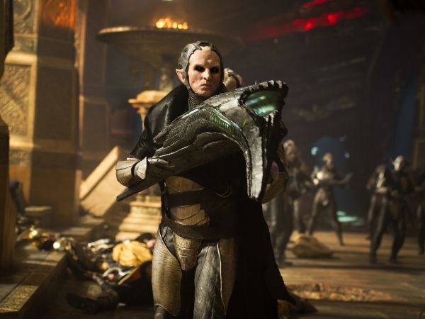 If the writers can be accused of making any misstep, it's the fact that they once again fall back on the tiresome world-destroying-weapon-and-the-villain-who-covets-it scenario. Although, to be fair, Eccleston is genuinely chilling in the role of Malekith, and Taylor keeps the action moving at a satisfying pace that distracts from the comic-book clichés of the plot. His efforts are perfectly complimented by top-notch costume design by Wendy Partridge (Blade II, Hellboy), who outfits the Dark Elves in some eerily unsettling armor, and a rousing score by Brian Tyler, whose compositions summon an appropriate sense of majesty without ever growing overbearing.
